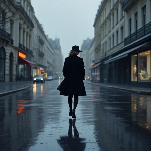Electronic noir, cinematic bass guitar, French vocals, classical piano, ambient rain |