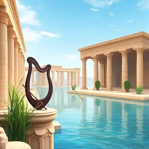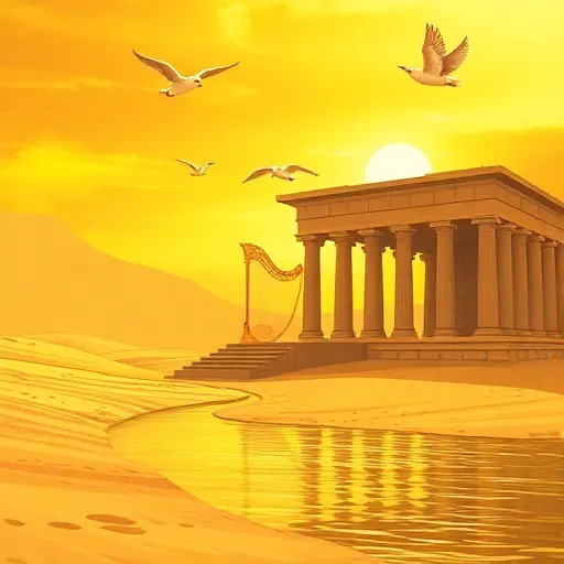 Create a mystical ancient Egyptian-style song using traditional instruments like Egyptian harp, flute, sistrum, and frame drum. Add atmospheric elements such as water flow, wind, and birdsong. Use modern pads and choir vocals for depth, with echo and...
