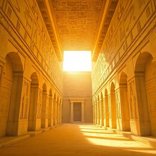 Ancient Egyptian orchestral, mystical temple ambiance, slow meditative rhythm, ethereal choirs