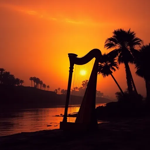 Create a mystical ancient Egyptian-style song using traditional instruments like Egyptian harp, flute, sistrum, and frame drum. Add atmospheric elements such as water flow, wind, and birdsong. Lo-fi, emo harmonies , Reflective, Egyptian vibe, deep ba...